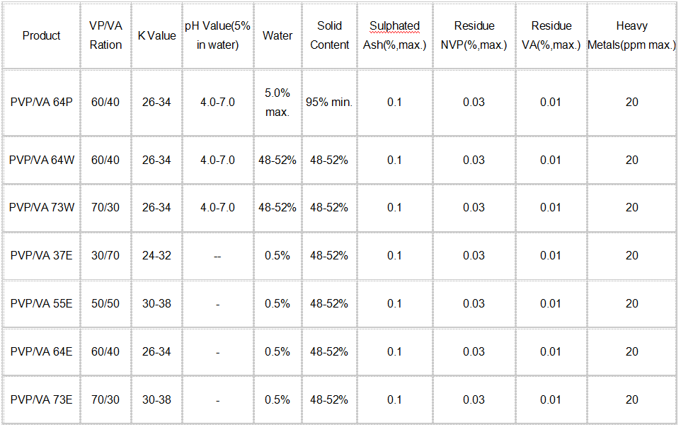 Product Properties:VP/VA Copolymers with different rations of N-Vinylpyrrolidone to Vinyl Acetate,soluble in most organic solvents.Which exists in powder,water solution and ethnol solution form.VP/VA compolymer forms hard,water-removable and glossy films,it has excellent compatibility with many plasticizers and modifiers,an the hydroscopicity decreases in proportion to the ration of Vinyl acetate.